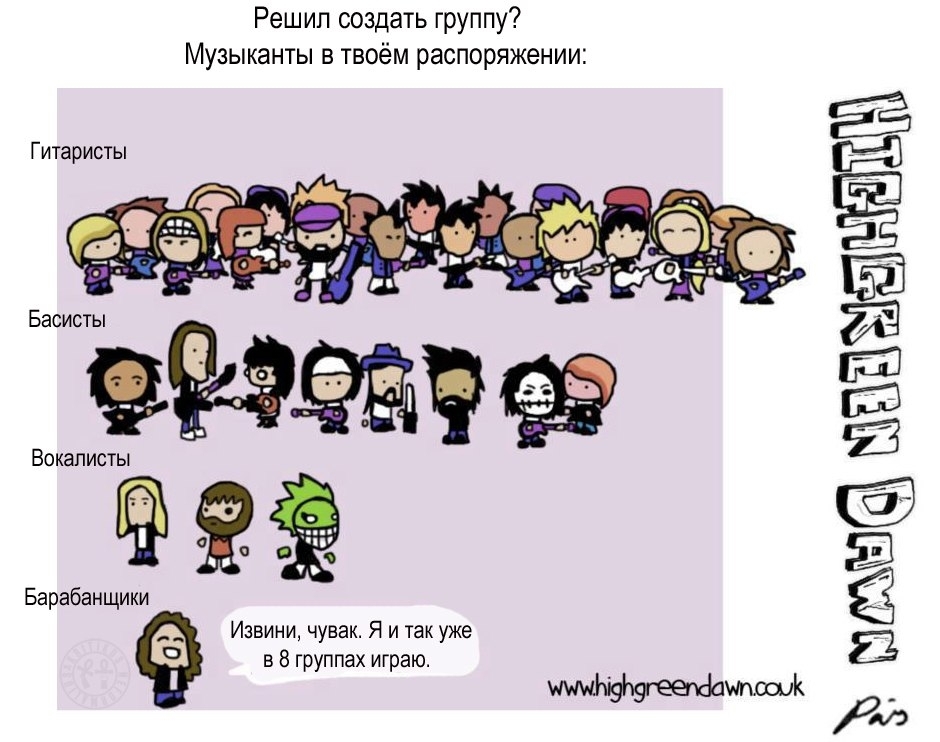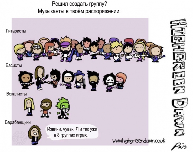 Першая праблема, зь якой сутыкаецца маладая рок зорка — гэта склад гурта. Як правіла, першымі ўдзельнікамі гурта становяцца сябры натхняльніка ўсёй задумы, а дакладней сказаць адзін лепшы сябар, зь якім разам з першага класа тусаваўся, зь якім першы раз паліць паспрабаваў, упершыню ў лайно нажраўся і г.д. Часьцей за ўсё гэты ж самы сябар і даў табе метал паслухаць. Далей стваральнікі пачынаюць абдумваць канцэпцыю гурта, яе стылістычны накірунак, назву і г.д. У рэальнасьці жа ўсе размовы суправаджаюцца вялікай колькасьцю піва, і ўжо праз гадзіну-паўтары яны пераходзяць у звычайную пьянку, якая суправаджаецца неўтаймаванымі марамі аб першым альбоме, выступленьні на «Tusca Open Air» і плянамі зрабіць гэта ўсё ў бліжэйшыя паўгады. Пры гэтым такія дробязі як няўменьне граць — у разлік нават не прымаюцца!