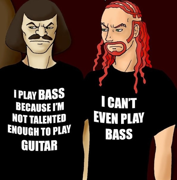 - Басіст з часам ўдараецца ў нейкую мегаскладаную, наварочаную і незразумелую простым смяротным музыку. У яго трэк-аркушы селяцца хрэн ведае адкуль нарытыя калектывы зь назвамі тыпу «Avender Sigmаs Grantirilium Manggra Floooo». Далей ён пачынае насіць клецістыя штаны зь шлейкамі, нюхаць мушкатовы арэх і цягацца па фестывалях аўтарскага кіно. Натуральна з групы ён сыходзіць, матывуючы гэта прымітыўнай гульней музыкаў. У выніку ён заканчвае як супермегапрофі, які грае ашаламляльнай складанасьці дзьвухгадзінныя салякі ў сябе на кухні для тараканаў, якія жывуць там
