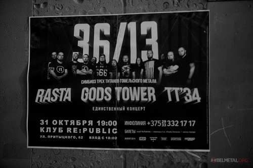 Часам яны вяртаюцца, як пісаў Стывен Кінг. Прайшоў роўна год пасьля The Greatest Reunion, і гомельскія монстры зноў далі аб сабе знаць, зладзіўшы шоу 36/13 у менскім Re:Public’у. Канцэпцыя мерапрыемства прадугледжвала, што трынаццаць музыкаў з трох цяжкавагавых калектываў – GodsTower, Rasta, TT’34 – сыграюць разам 36 кампазіцый і нагадаюць, чым славутая гомельская метал-сцэна.