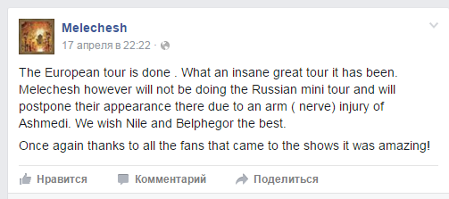 Цікава, што з усяго складу The Flaming Arts Fest пытаньні выклікалі толькі Nile і Belphegor. Цяжка было, напэўна, у нечым абвінаваціць Melechesh. Нацызм? Ну такое. Сатанізм? Таксама ня вельмі вяжацца з гуртом з Ізраілю. Таму, скаргі сканцэнтраваліся на астатніх двух гуртах, а Melechesh знайшлі іншую падставу для саскоку з туру. Melechesh Ashmedi, гітарыст і вакаліст, пашкодзіў руку і адмяніў шэраг канцэртаў у Беларусі і Расеі. Усё б нічога, але для прыстойнасьці можна была б і папрасіць прабачэньня ў фанатаў.