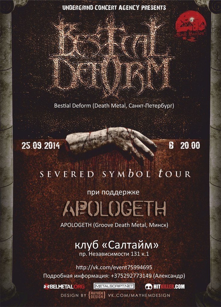 •BESTIAL DEFORM (Death metal, Санкт-Пецярбург) вяртаюцца ў Менск у рамках SEVERED SYMBOL TOUR. Найстарэйшая піцерская, для большасьці ня маючая патрэбы ў прадстаўленьні death metal банда, заснаваная ў 1990 годзе. Некаторы час была ў цені, але ізноў падняла свае сьцягі шматаблічная машына сьмерці, садысты, якія смакуюць ад канвульсій і агоніі. Расьпінаючыя веру, Bestial Deform разарвуць вашыя галовы ў трэскі.http://vk.com/bestialdeform
