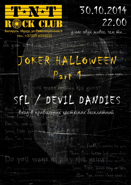 Самая жудасная вечарына году ў дзьвюх частках. Частка 1. Усё тая ж жахлівая атмасфера ды гарачыя кактэйлі. Жывая музыка, выдатны настрой — усё гэта Joker Halloween. Part 1.SFL — кактэйль з трох прыгажунь, якія граюць вельмі энергічную ды танцавальную музыку.