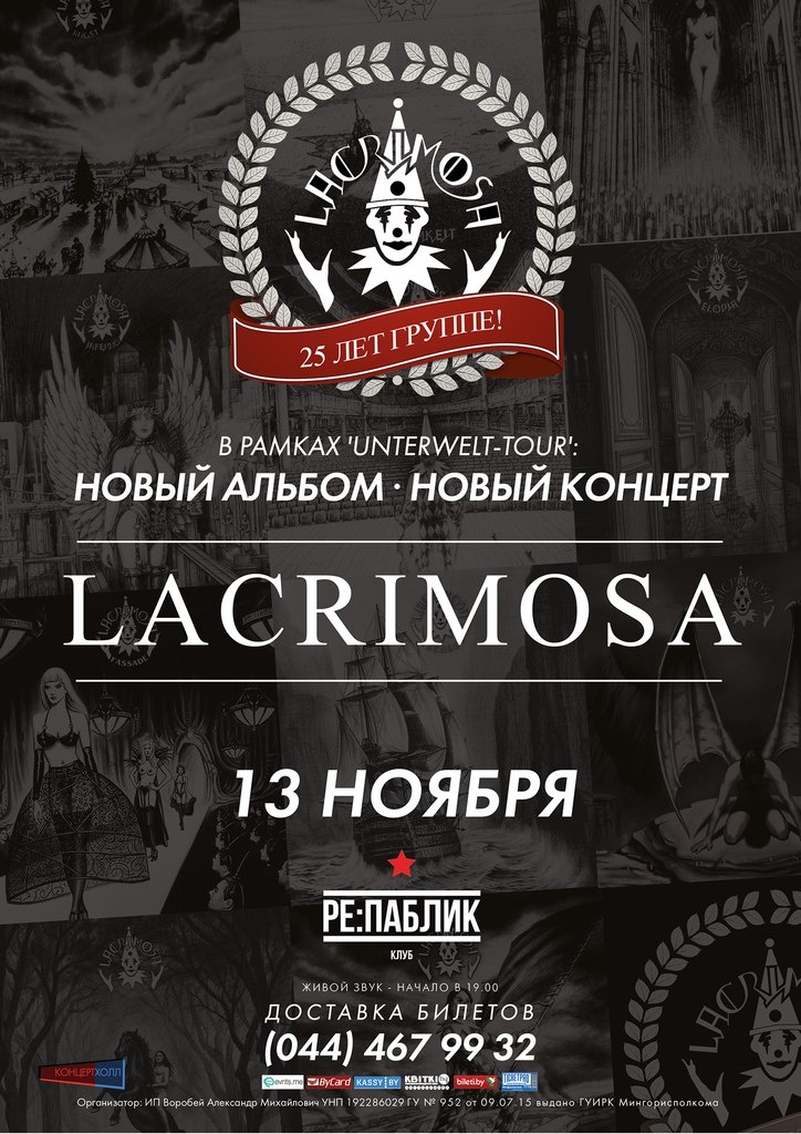 13 лістапада аматары швейцарскай готыкі LACRIMOSA вяртаюцца ў Менск. Канцэрт адбудзецца ў клубе «Re:Public» у рамках новага «Unterwelt-Tour».Арганізатар: «Концерт Холл Групп»