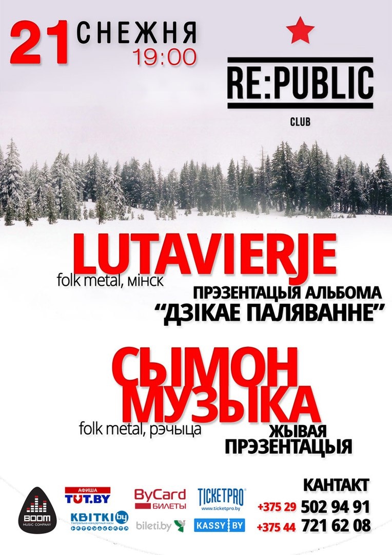 Lutavierje выступіць з прэзентацыяй новай кружэлкі “Дзікае Паляваньне”Адмысловыя госьці – Dialectic Soul. Публіка пабачыць эксклюзіўны выступ гурта з праектам Сымон-Музыка, песьні якога раней існавалі толькі ў студыйным варыяньце і ніколі не выконваліся на сцэне