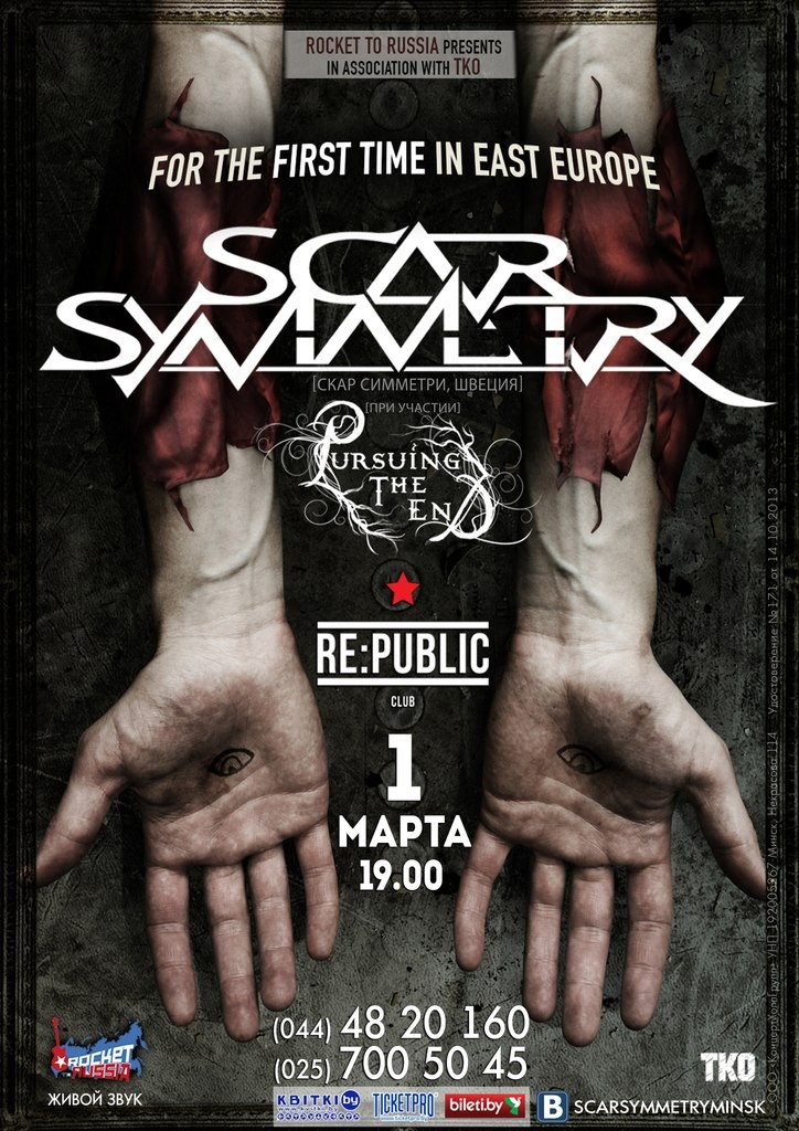 Шведскі мелодык-дэз гурт Scar Symmetry выступіць ў беларускай сталіцы ў першы дзень вясны 2014-га году. Пры падтрымцы Pursuing The End (Італія)Месца: Менск, клуб «Re:Public»(вул. Прытыцкага, 62).