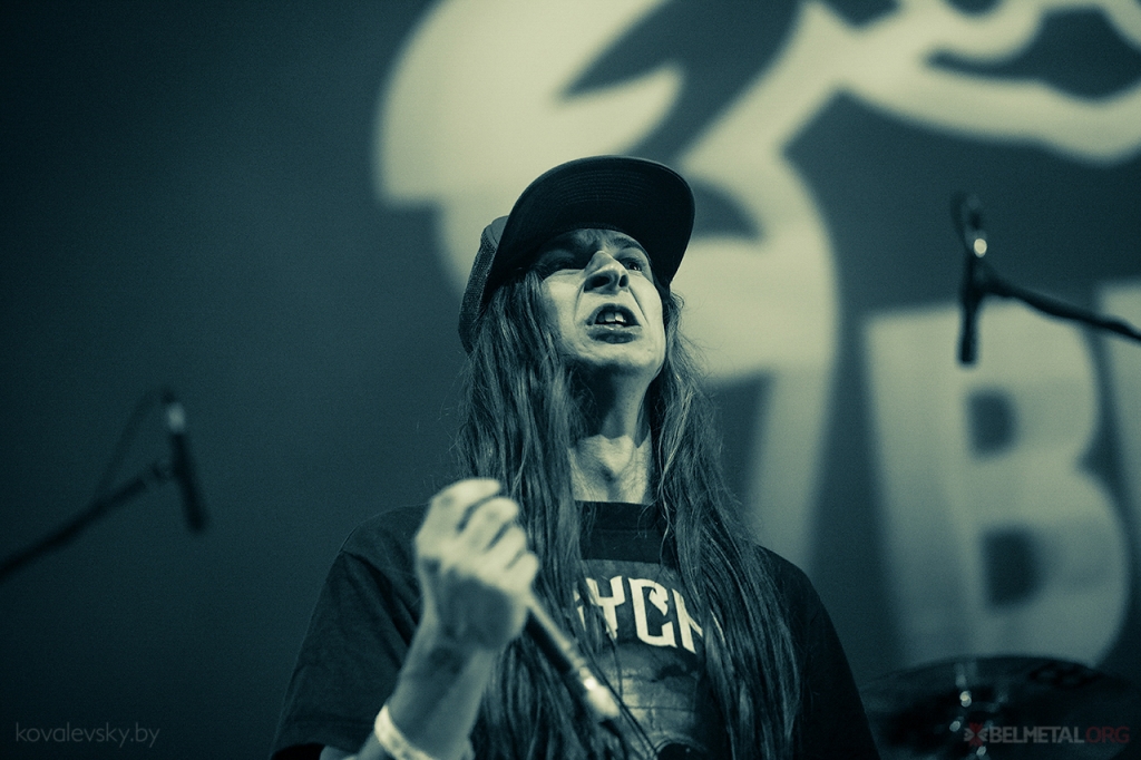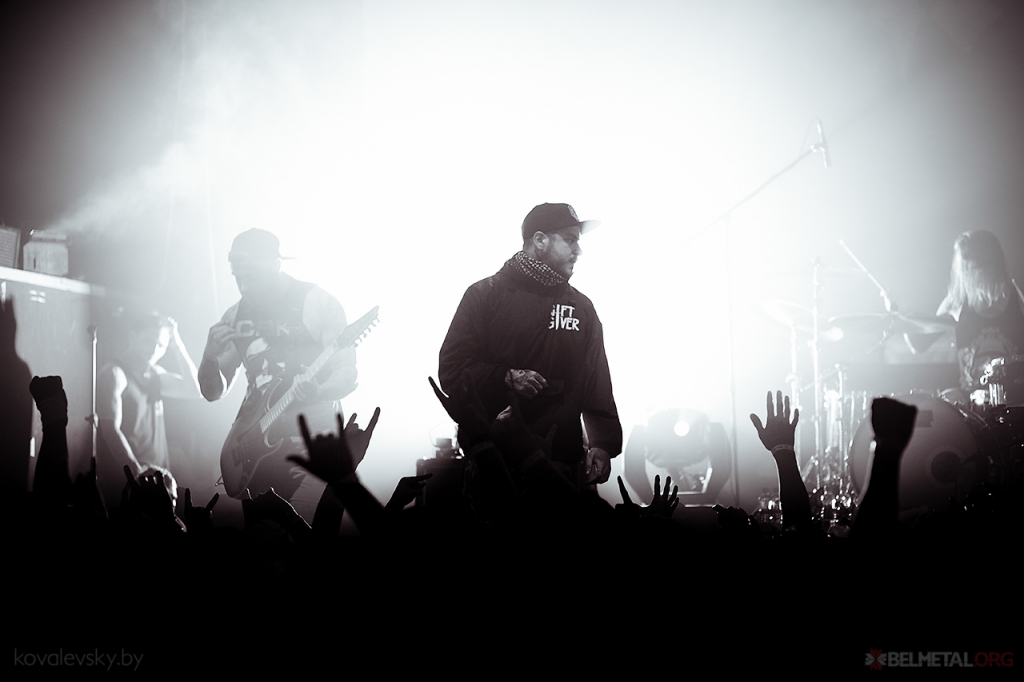 Доўга чакаць Caliban не прыйшлося, пад радасныя крыкі зайграў уступ да песьні King, што адкрывае і апошні альбом, і канцэртнае турнэ. Музыкі бадзёра падымаюцца на сцэну і адразу даюць з “месца ў кар’ер”, у некалькі імгненьняў расхістаўшы ўсю залу. Адразу трапіла ў вочы адсутнасьць асноўнага гітарыста і аўтара песень Марка, які, на жаль, ня здолеў прыехаць. Спадзяемся, наступным разам усё будзе добра. Тым часам вакаліст Эндзі распавядае са сцэны аб тым, што каленка баліць, скакаць ён ня будзе – таму, маўляў, вы павінныя адтапырвацца ўдвая. Пасьля гэтых словаў пачынаецца сапраўднае бясчынства – дайверы лезуць на сцэну адно за адным, а тое і па некалькі, саскокваюць у шчыльны натоўп перад сцэнай, а Эндзі пасьпявае з кожным паабдымацца, паціснуць руку, даць паравець у мікрафон, зрабіць сэлфі на мабілку, камусьці нават падпісваў плакат падчас выкананьня песьні, што мабыць перабор ужо.